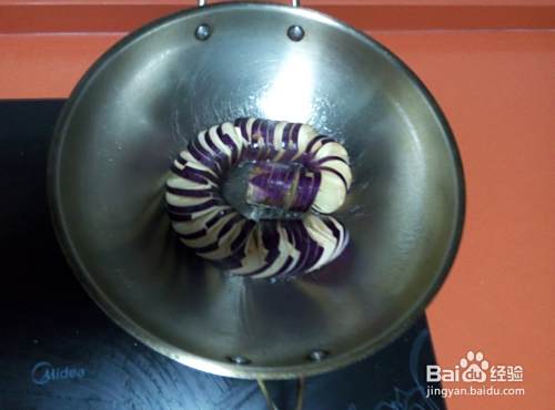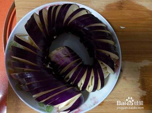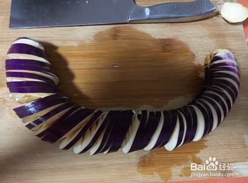 整只茄子洗净,60度角切0.5cm片,注意不要切断,离底部大概1-1.5cm即可,如果不好把握,可以在茄子两侧各放一支筷子固定
