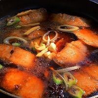倒入事先调好的汁。再倒入适量水,水的量以没过鱼段为宜。开上锅盖,小火慢熬。直到汤汁收浓了。根据自己口味看情况添加少量盐。
