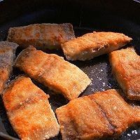 把鱼段轻轻拍一层面粉与生粉的混合粉。。平底锅中小火煎两面金黄