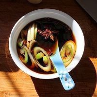 取一个碗,调汁,放入:葱,姜,蒜,大料,花椒,生抽,老抽,料酒,糖。再倒入适量清水。所有的料与清水的比例差不多为1:1左右。