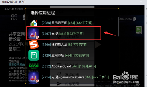 点击悬浮窗,这时候会弹出选择用进程的弹窗,点击选择第一个光遇的游戏进程,然后点击开启辅助。