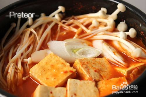 取石锅放入泡菜,加高汤和一勺韩式辣酱煮开。