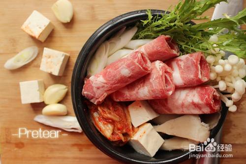 原料图。配料比例随便,自己爱吃什么就多放点什么,除了泡菜和肥牛卷,其他材料都可以增减和替换。