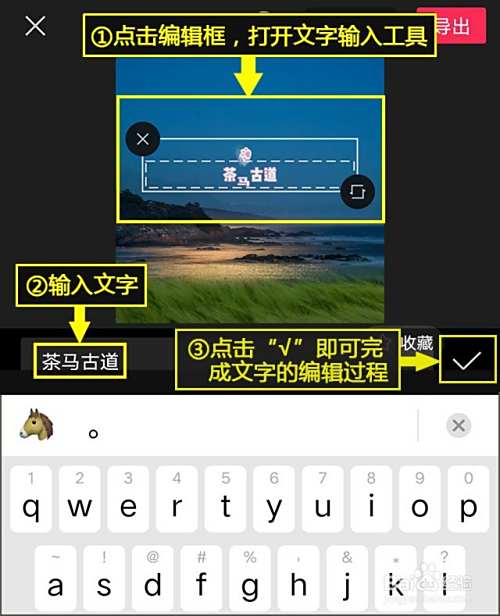 文字编辑。点击编辑框,打开文字输入工具,输入文字,点击“√”即可