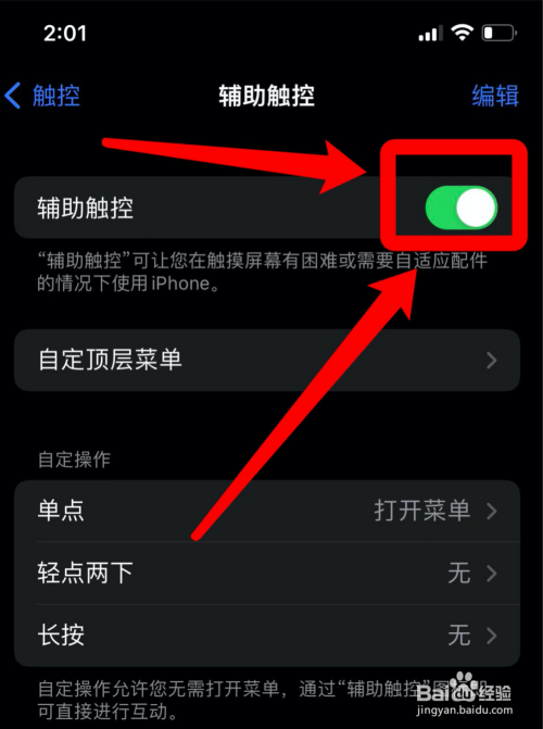 进入辅助触控页将“辅助触控”功能点亮,即可将悬浮图标设置出来。