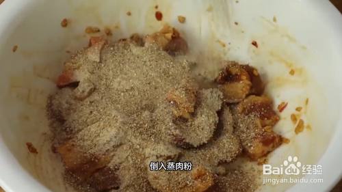 倒入蒸肉粉,加入清水湿润,搅拌均匀。