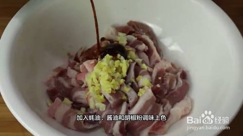 五花肉切片,生姜和蒜切沫,放入五花肉上面,加入蚝油、酱油和胡椒粉调味上色,抓匀腌制三个小时。