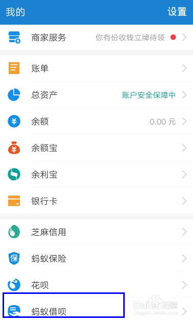 首先打开支付宝软件,然后点击右下角我的按钮,进入个人页面之后往下滑动页面找到蚂蚁借呗并点击