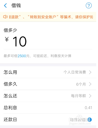 接着填上借的金额以及用途和还的额度