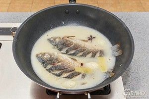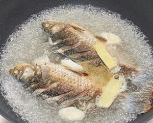 锅内加入适量食油用油烧热放入鲫鱼两面煎至金黄。