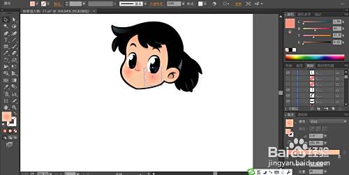 我们用黑色填充女孩的头发,用粉色的渐变填充女孩的脸蛋,再用黑色与白色搭配填充女孩的眼晴,我们用粉色的径向渐变填充女孩脸上的红晕。