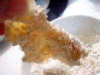 在裹地瓜粉的时候,一定要用手把地瓜粉按实,这样炸的时候粉就不会掉下来,油也不会糊掉!