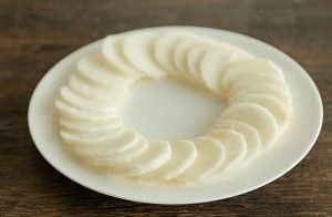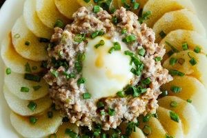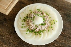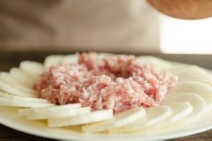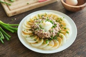 肉糜加姜末、盐、白胡椒粉搅拌均匀后,码放在山药中间,并留一个圈