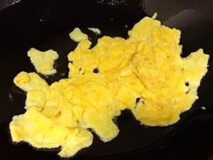 热锅热油,入打好的蛋液,即转小火,用筷子/铲子划散,片刻后锅离火,用锅内余温将蛋液基本凝结盛出备用