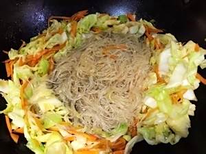 入1-2勺生抽,1小勺糖,翻炒均匀,锅内中间留空入粉丝(入粉丝前可蘸菜汁尝尝咸淡加以调整)