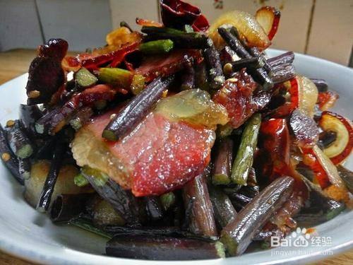 锅内放入少许油, 放入蒜末炒香,放入腊肉翻炒至变色,放入蕨菜翻炒2分钟。