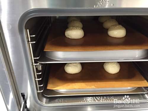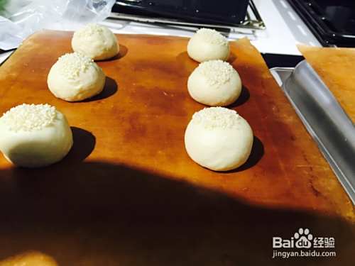 将分割好的面团排气,撮圆,在表面粘芝麻