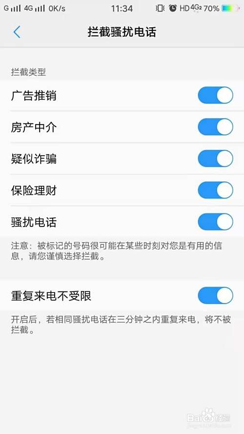 我们可以利用手机本身自带的安全软件进行骚扰拦截。打开手机管家,找到骚扰拦截功能,点进去把里面的骚扰拦截一系列功能全部打开。然后当有骚扰电话进来的时候,手机会自动帮你屏蔽骚扰电话。