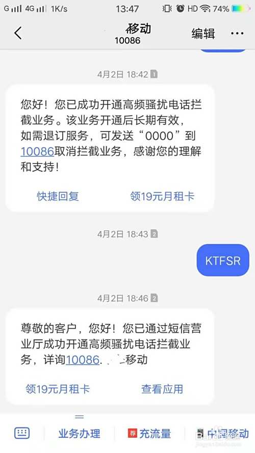 编辑短信KTFSR发送给10086,让信号卡帮你拦截,这种方法能有效的帮你过滤掉骚扰电话,筛选有用的电话。防止因电话拦截,而有事找你又联系不上你的情况发生。这项套餐功能是10086推出的电话拦截功能,套餐不收费,可放心开通。
