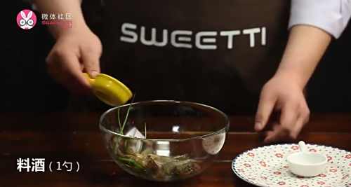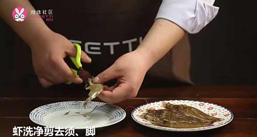 2碗中放入葱,姜,虾,加入料酒,盐抓匀腌制。