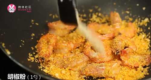 4蒜末炒香,放入虾,面包糠,胡椒粉,辣椒粉,盐炒熟即可出锅。END