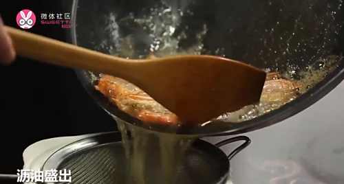 3油温7成热炸虾,虾炸至深红色,沥油盛出。