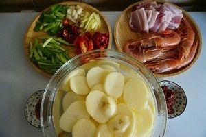 土豆去皮切厚片泡入水中,五花肉切片,虾剔除虾线,其余食材全部切好、准备好~