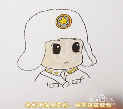 接下来我们给帽徽涂上黄色和灰色,用黑色仔细涂出眼睛的颜色,然后用肤色涂雷锋的脸部皮肤