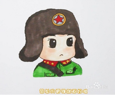 给帽徽上的五角星叠加一层红色,然后用深棕色涂帽子,衣领也涂成红色,衣服涂上绿色、带子涂黑色,简单的雷锋就画好了。