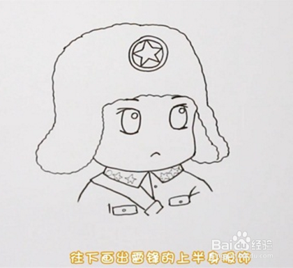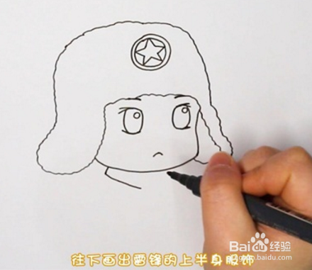 我们首先画出雷锋头上一顶大帽子,在帽子上画上一个五角星帽徽,接着画出脸型,再画上眉毛、眼睛和嘴巴。