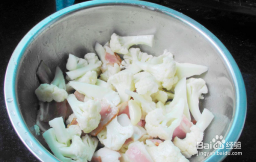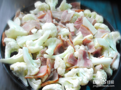 4.花菜捞出沥干,与培根、蒜片一起放大碗里,加油拌匀;