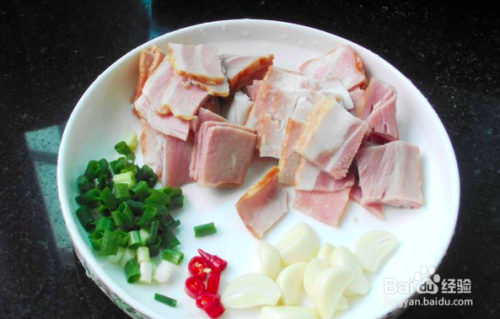 3.培根切小片; 蒜切半; 葱切粒; 辣椒切末;