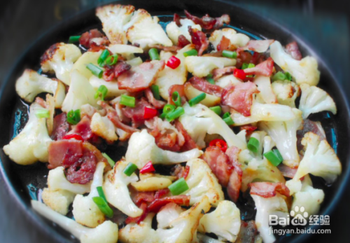 6.烧至培根出油焦黄,撒上辣椒碎和适量盐,最后撒上葱花即可。