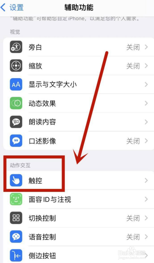 第一步,我们找到辅助功能界面中的触控选项并点击进入。