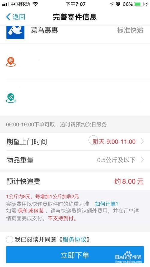 最后,勾选我已阅读并同意,点击立即下单,然后等到预约的时间快递员上门收件即可。