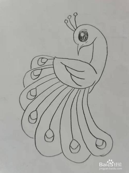 最后,画孔雀的漂亮尾巴,卡通孔雀简笔画,就完成了。