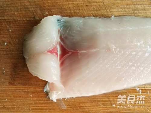 3去除腥线,沿着大骨将鱼片成两片,斜刀切下排刺。