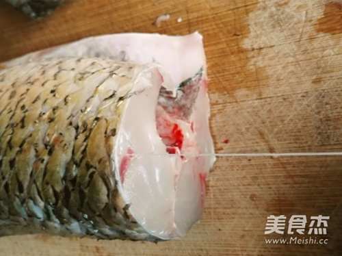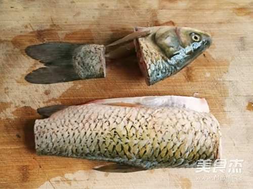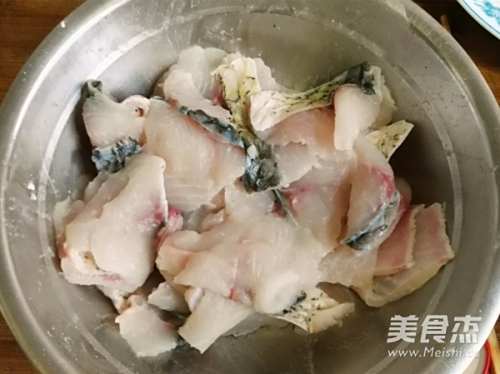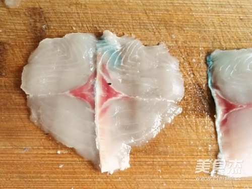 5斜刀将鱼片成2毫米厚鱼片,第一刀不切断。