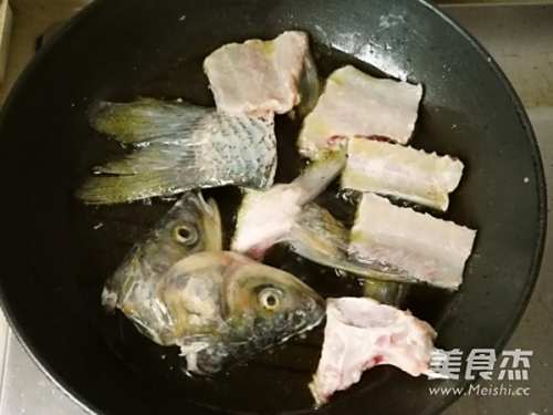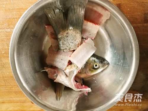 4头劈成两半、大骨切段和鱼尾放在一个盆中,加入10毫升料酒、3克胡椒粉,搅拌均匀,腌制30分钟。