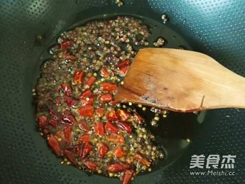 13炒锅放10克食用油,油热后放入花椒、麻椒、干辣椒煸香。