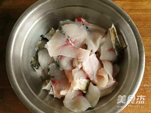 7鱼片片好后,将排刺剁块,一起放入另外一个盆中,加入10毫升料酒、3克胡椒粉,搅拌均匀,腌制30分钟。