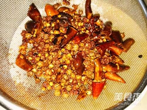 14将花椒、麻椒、干辣椒捞出备用。有料理机的可以打碎替代配料中的辣椒面,没有料理机的就留着炒别的菜用吧。