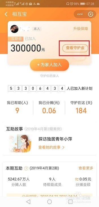 第二步点击相互宝,进去之后,点击查看守护金,如下图所示: