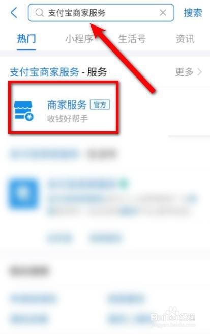 打开手机里面的支付宝,从搜索中输入商家服务并进行搜索,打开后点击设置,开通即可。