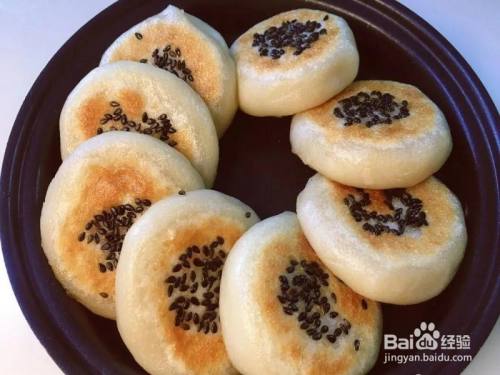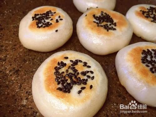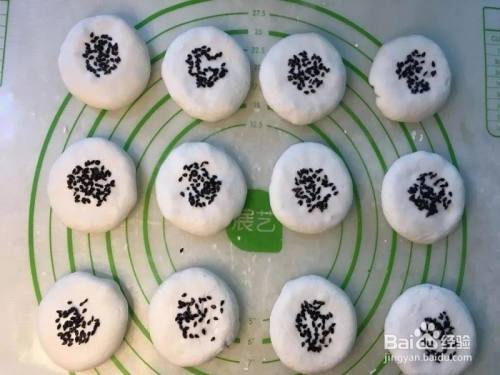 饼的中间抹点水,擀面杖的一头也沾上水再沾上黑芝麻轻轻压在饼的中间