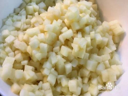 苹果削皮后切成小细丁,苹果比较小用了三个,买大点的苹果用2个就足够