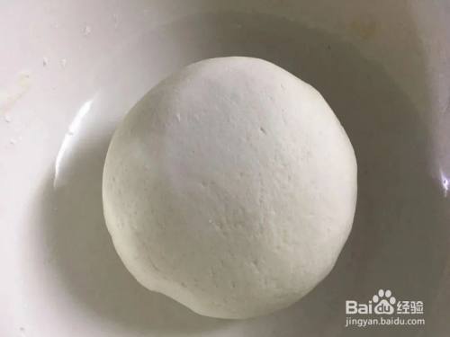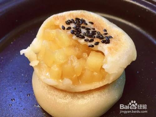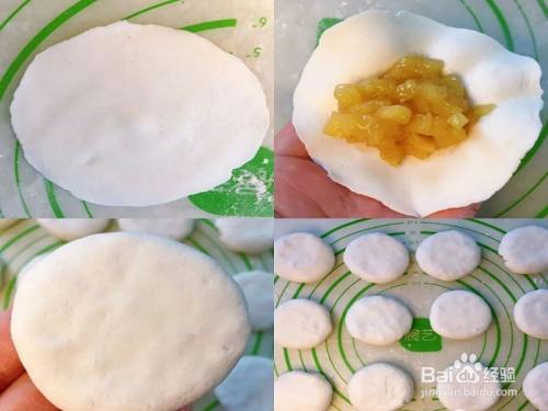 擀成中间厚边沿薄的面皮,中间放上苹果馅,像包包子一样包好,收口朝下轻轻压扁