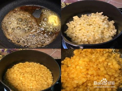 锅中倒入白糖,小火炒至白糖融化变成焦糖色后加黄油,再倒入苹果丁,炒至苹果丁变软后倒入淀粉水,煮至黏稠盛出备用