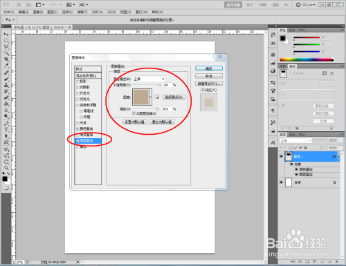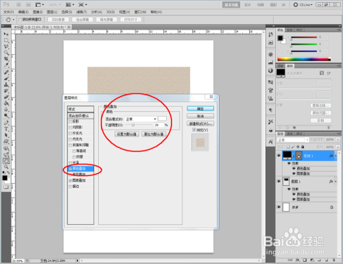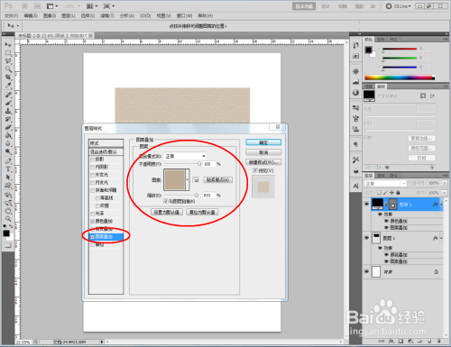双击图示自定义图案图层空白区域,弹出【图层样式】设置栏,按图示设置好图层样式的各个参数,完成异形着色墙面效果的制作。