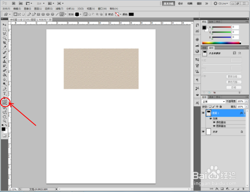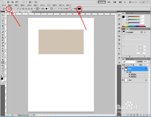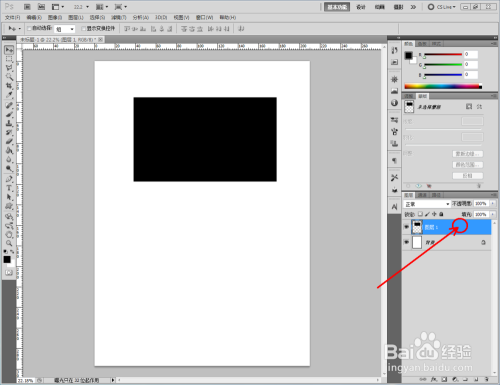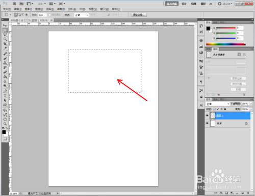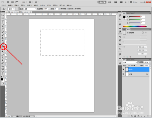 点击右下角的【新建图层】图标,新建一个空白图层。完成后,点击【矩形选框工具】,按图示在作图区域绘制一个规则的矩形选框。点击【油漆桶工具】将选框区域填充为:黑色(如图所示);